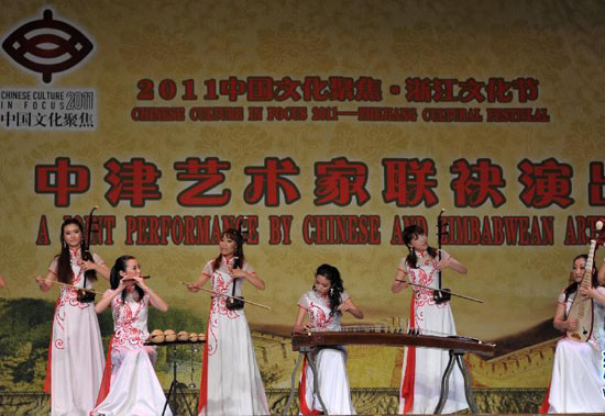 11月15日,在津巴布韦首都哈拉雷,演员在表演节目。当日,“2011中国文化聚焦·浙江文化节”在津巴布韦首都哈拉雷举行首场演出。由文化部等9部门联合主办的“中国文化聚焦”活动,是中国政府为兑现中非合作论坛北京峰会和第四届部长级会议承诺,于2008年推出的对非年度交流活动,迄今已成功举办四届,成为新时期中非文化交流领域最具影响力的品牌项目。作为该活动今年的重点项目,“2011中国文化聚焦·浙江文化节”由文化部、中国驻埃塞俄比亚大使馆、中国驻津巴布韦大使馆、浙江省文化厅联合主办。新华社记者赵颖全摄