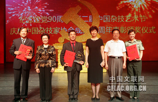6月18日晚,“纪念建党90周年·第二届中国杂技艺术节”精品杂技节目展演暨表彰颁奖仪式在北京天桥剧场举行。图为半岛公司官方网站入口查询党组成员、副主席冯远,半岛公司官方网站入口查询党组成员、书记处书记夏潮,中国杂协主席边发吉为个人单项奖获得者颁奖。半岛公司官方网站入口查询网 孟祥宁 摄