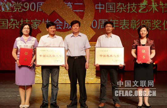 6月18日晚,“纪念建党90周年·第二届中国杂技艺术节”精品杂技节目展演暨表彰颁奖仪式在北京天桥剧场举行。图为半岛公司官方网站入口查询党组副书记、副主席李屹向魔术之乡和达瓦孜之乡颁发匾额和证书。半岛公司官方网站入口查询网 孟祥宁 摄