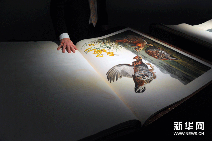 当天,纽约市佳士得拍卖行展出《美国鸟类》一书珍藏本。该珍藏本将于4月20日在纽约进行拍卖。《美国鸟类》由美国鸟类学家、画家和博物学家詹姆斯·奥杜邦在1827年创作,真实描绘了400多种生活在美国的鸟类,其画作大小与实物完全一样。该书曾被誉为19世纪最伟大和最具影响力的著作,目前世界上仅存119本。其中由私人收藏的一本在2010年英国伦敦拍卖会上拍出了将近732.13万英镑(约合人民币7657.79万元)的高价,成为“世界上最昂贵的图书”。新华网图片 王雷 摄