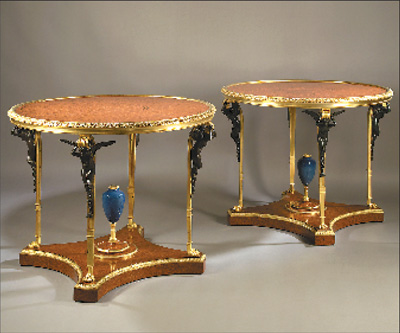 此次拍卖活动的拍品亮点颇多,古董家具方面有多款在法国古董家具历史上具有代表性的人物弗朗索瓦·林科(Frankgois Linke)的作品,其中一对路易十六风格铜腿紫檀面圆桌(见图二),简洁大气又不失华贵。钟表拍品中有一件约1865年产自法国的三件式钟表,均采用鎏金铜内填珐琅的工艺制成,华丽而优雅。银器也是本次拍卖中重要的组成部分,一件银与玻璃完美结合的维多利亚时期摆件是其中的代表。本次拍卖的版画作品中有多幅著名画家的限量珍品。其中,现代艺术之父安迪·沃霍尔1981年在丝网彩印基础上附钻石粉工艺所作的《神话 米奇》(见图一),巴勃罗·毕加索的《四裸女》、《坐着的女人》,马克·夏加尔的《家庭的丑角》,以及萨尔瓦多·达利9张一组的版画《风景九幅》等都是难得的藏品。