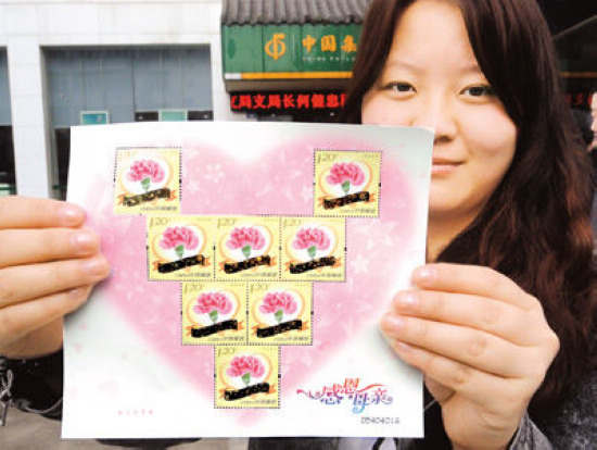 江苏苏州一名集邮爱好者在展示刚购买的《感恩母亲》特种邮票心型小版。