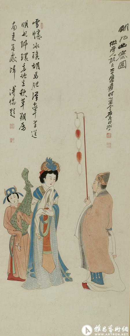 张大千《明妃出塞图》描绘了昭君随使出塞的一幕,绘制该作的时间已在大千自敦煌归来后,故人物的线条虽不改其秀丽但益趋圆劲,设色虽绚丽而不失清雅明净,是互参敦煌壁画以及《韩熙载夜宴图》以后的新境界。大千将明妃画得明艳照人,神色却流露内心淡淡哀怨,楚楚可怜,发黑如丝绒,是以突显人物神采专用于仕女眼睛和头发的槟榔墨所染,与泥金勾勒的石黄、朱砂、石青凤冠,形成强烈的对比。1945年12月,张大千为筹集资金,购买由长春溥仪伪满洲国宫内散出的名画,在中山公园水榭与于非闇合开画展,画上有溥儒的题诗,所以此画有可能是当时展出的作品之一。