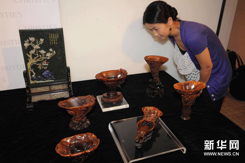 (1)11月16日,佳士得拍卖行工作人员在观看犀牛角雕刻工艺品。