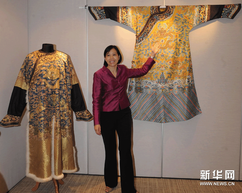 (4)11月16日,专家在介绍清朝明黄缎十二章九龙吉服袍(右),估价100万至150万港元。