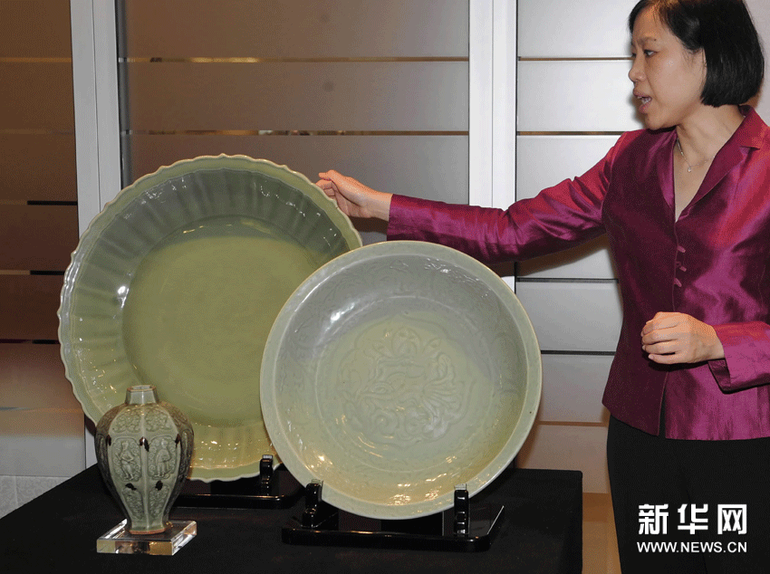 (3)11月16日,专家在展示明朝龙泉青釉盘。