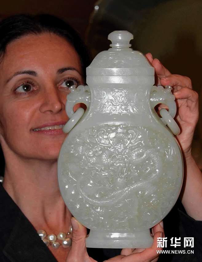 (2)11月16日,专家在展示清朝乾隆年间御制白玉雕穿花八吉祥盘龙纹双兽活环耳盖瓶,估价2800万至3500万港元。