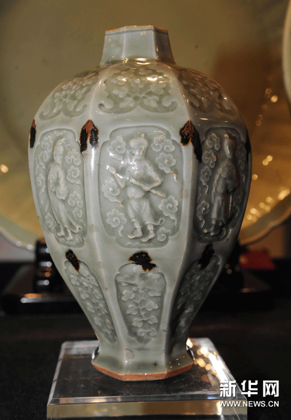 (5)11月16日拍摄的元朝龙泉青釉印花卉八仙图八棱梅瓶,估价400万至700万港元。