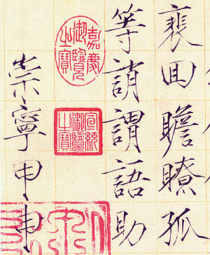 此前广东媒体报道,在深圳拍出的瘦金体《千字文》书法的落款也为“崇宁甲申岁宣和殿书赐童贯”。此册“千字文”在清朝再次由皇宫收藏,落入了另一位喜好书画的皇帝——乾隆手中。乾隆在“千字文”上留下了“八徵耄念之宝”珍赏印。