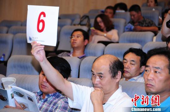 “中国当代名家大师精品力作拍卖会”8日在天津港博览馆举行。图为拍卖会现场。 薄承 摄