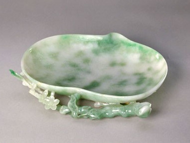 翠呈浅绿色,局部色较重。作品似盘,较浅,桃实形。洗底浮雕桃枝两杈,一杈伸于洗底为足,其上有双桃并桃花,另一杈延伸至洗口一侧为柄。