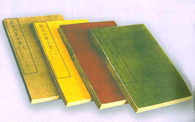 《四库全书》是用浙江出产的上等开化纸缮写的。书册封面采用丝绢装裱,绢面色彩遵循乾隆帝“经、史、子、集四部各依春、夏、秋、冬四色”装潢的理念,即用象征四季的颜色来标明书的类别:经书是儒家经典,居群籍之首,尤如新春伊始,饰以葵绿色;史部为历史典籍,著述浩博,如火之炽,应用红色;子部采撷诸子百家之学,如同秋收,饰以蓝色;集部诗文荟萃,好似冬藏,饰以灰褐色。一目了然。南三阁之书与北四阁之书稍有差别,经、史两部不变,而前者的子部为玉色,集部为藕荷色,仍不离取法春夏秋冬四季的初衷。