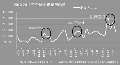 总结近3年来贺岁档(每年11月16日至次年2月15日)的观影人次和票房:2010年至2011年贺岁档为8780万人,产出316217万元票房;2011年至2012年约为11095万人,产出399387万元;2012年至2013年约16699万人,产出590865万元,可发现各数据呈逐年递增之势。