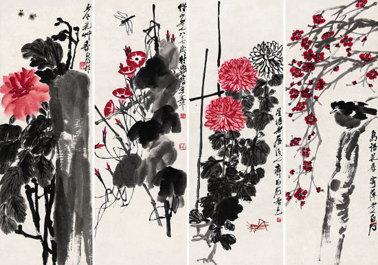 他独创的“红花墨叶”亮色花卉,再加上白色的宣纸,三种颜色形成强烈对比,这种高纯度的色相和补色对比,体现出了大众化的色彩倾向,造成了浓烈而鲜亮的视觉效果。某种程度上说,这种大众化、民间化的色调原则也构成了当代绘画的色彩基础。