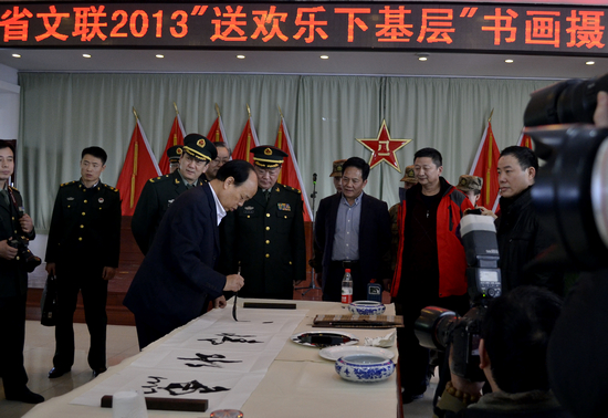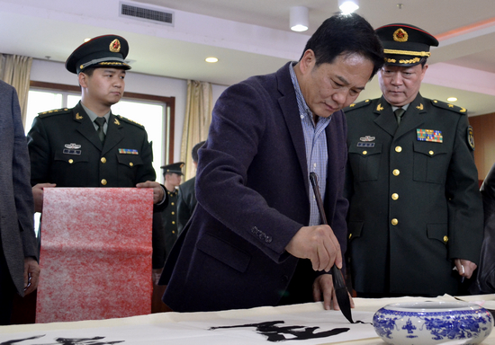 简短的仪式结束后,由省文联主席、省书协名誉主席李才旺同志为活动开笔,那饱含真情、苍劲刚健的“鱼水情深”,拉近了官兵们和艺术家们的距离,表达了艺术家们对广大官兵的崇敬之情。书画家们随即投入了紧张的创作中,此时,几乎每位艺术家的案桌前都被官兵们“团团围住”,有些甚至排起了长队。官兵们自选对联内容,然后由艺术家题写。“福星高照全家福、春光耀辉满堂春”、“小康家庭欢乐日、春回大地艳阳天”……一副副对联寄托着广大官兵美好的愿望,也凝聚着艺术家们对战士们的浓浓情意。