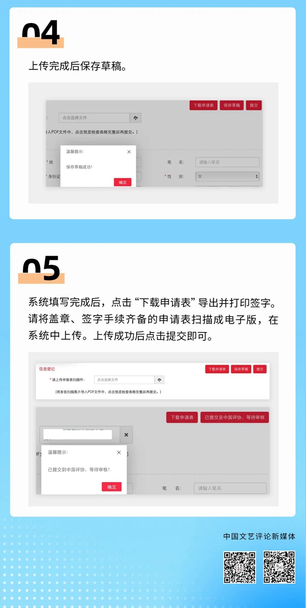 所填报信息及申报作品须真实有效,有抄袭、剽窃行为的申请者,中国文艺评论家协会将取消其五年内的申请资格;