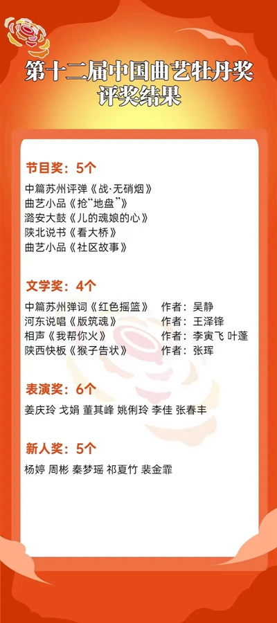 本届中国曲艺牡丹奖共收到来自中国曲协32家团体会员、艺委会、曲艺联盟、中直文艺院团、省级文化馆以及香港、澳门、台湾地区有关团体报送的涵盖120个曲种的472个节目,报送数量为历届之最。经初评、4个分赛区比赛、终评,共评出节目奖5个、表演奖6个、文学奖4个、新人奖5个。颁奖仪式上,还为苏州评弹表演艺术家赵开生、河南坠子表演艺术家马玉萍、二人转表演艺术家蔡兴林颁发“半岛公司官方网站入口查询终身成就曲艺艺术家”荣誉称号,褒扬三位艺术家在曲艺艺术方面取得的卓越成就、为曲艺事业作出的杰出贡献。