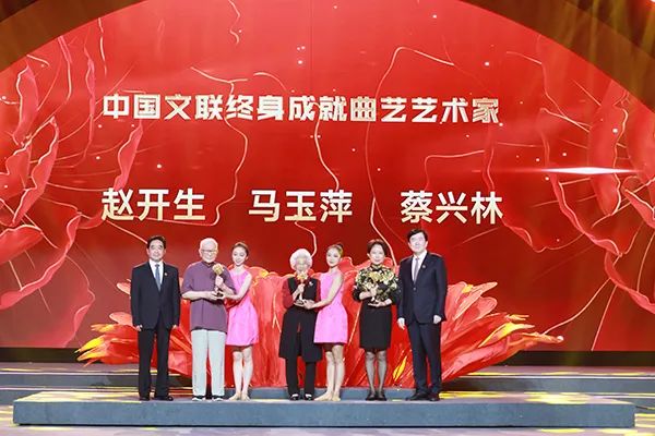 相声表演艺术家李金斗、音乐家韩红为第十二届中国曲艺牡丹奖表演奖、新人奖获奖代表颁奖。